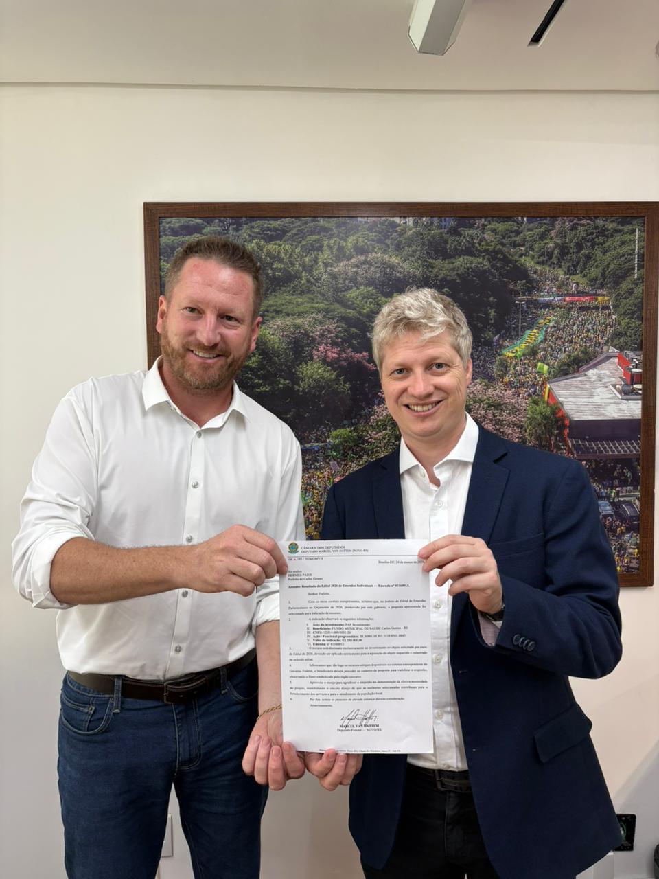 Através de emenda parlamentar destinada pelo Deputado Federal Marcel van Hattem, o município de Carlos Gomes garantiu o valor de R$ 390.000,00. Este recurso será destinado exclusivamente à aquisição de uma nova van para a Secretaria Municipal de Saúde.